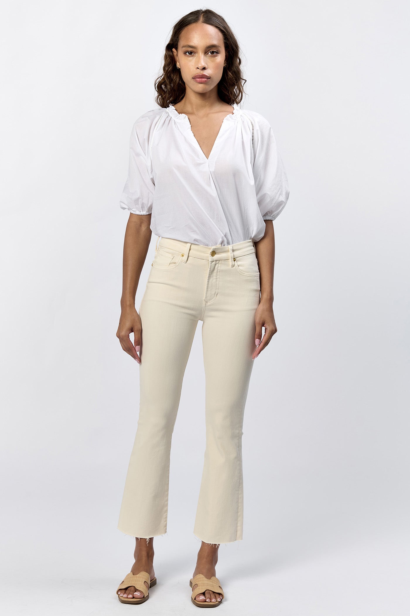 The perfect palette of colors in our Jeanne mid rise raw cut hem jeans in cropped inseam.
