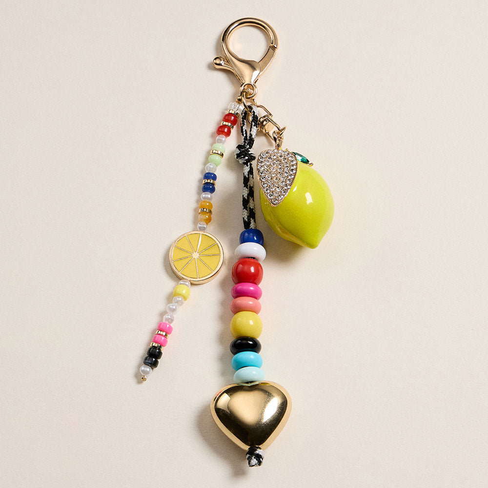 • Vibrant keychain featuring a beaded strand, gold heart, and a glossy lemon charm with rhinestone detail. Perfect for adding a playful touch to your keys or bag.