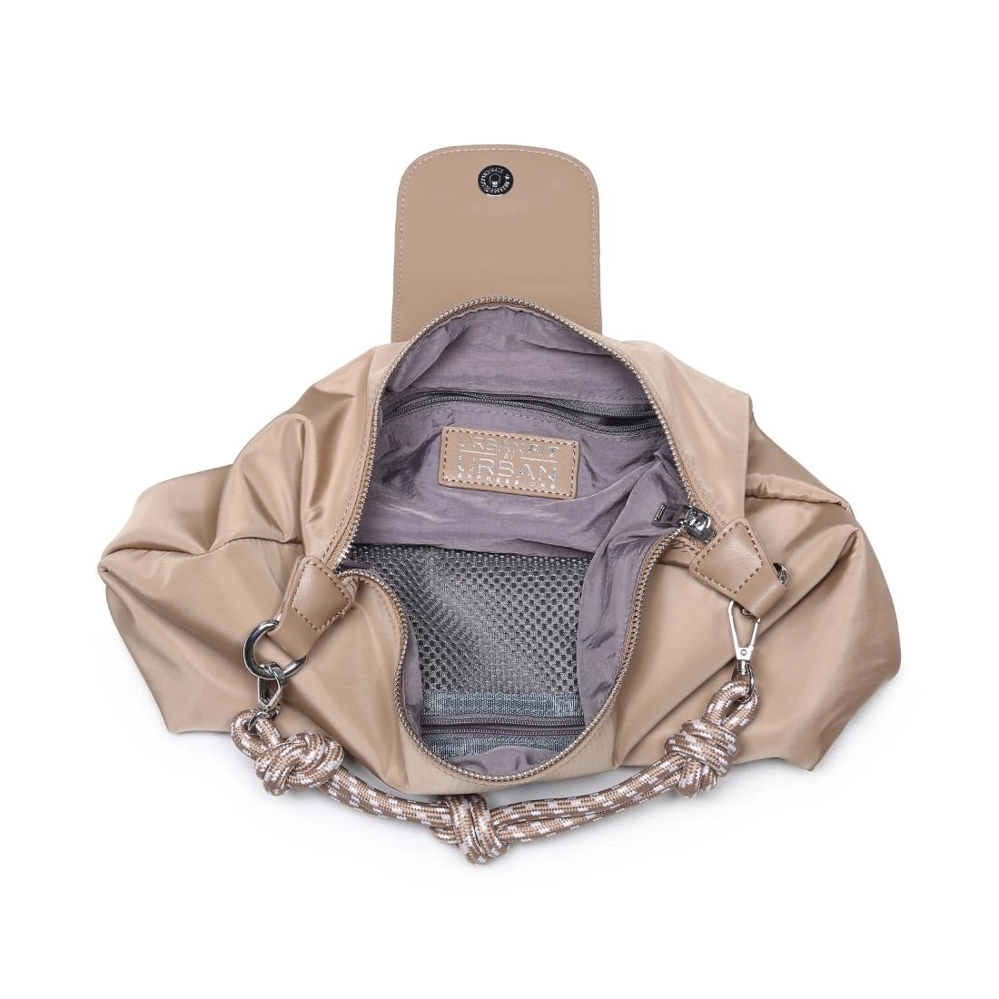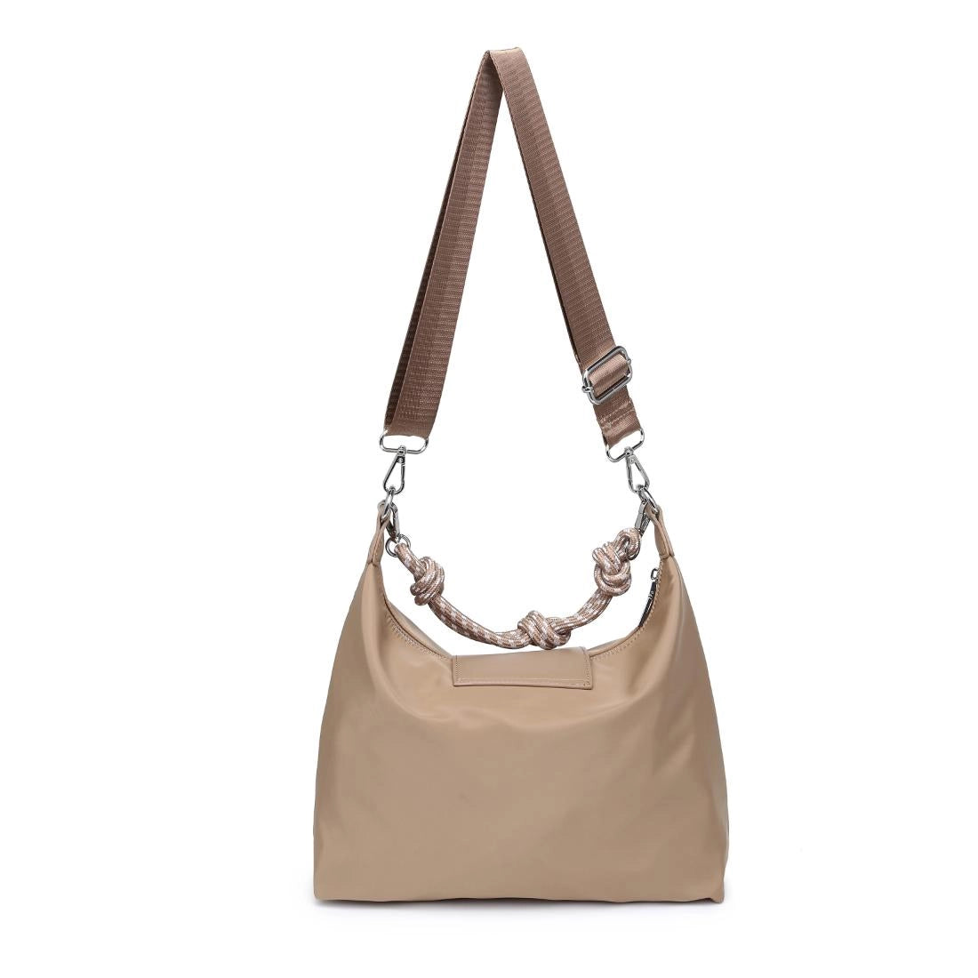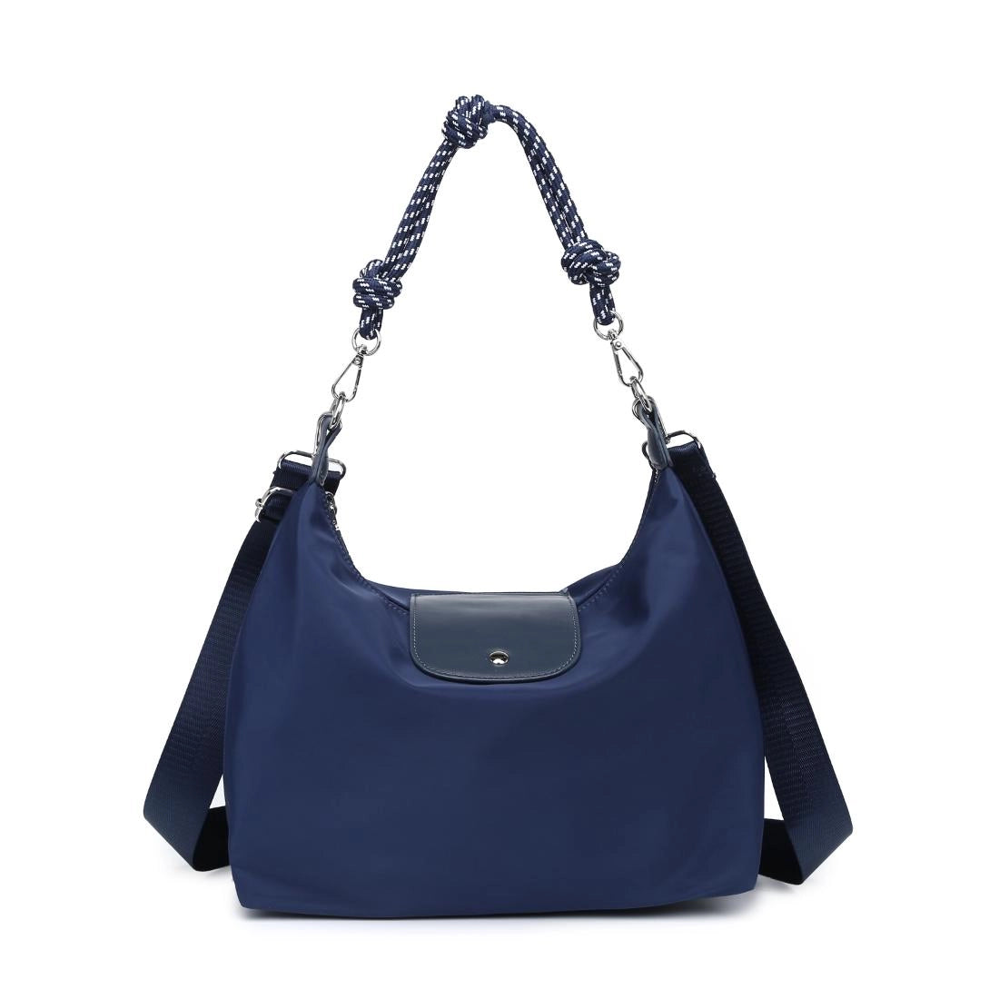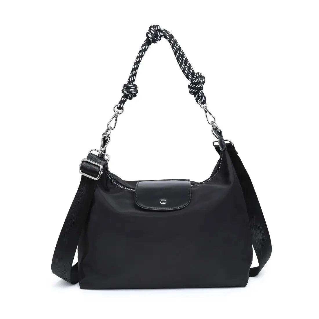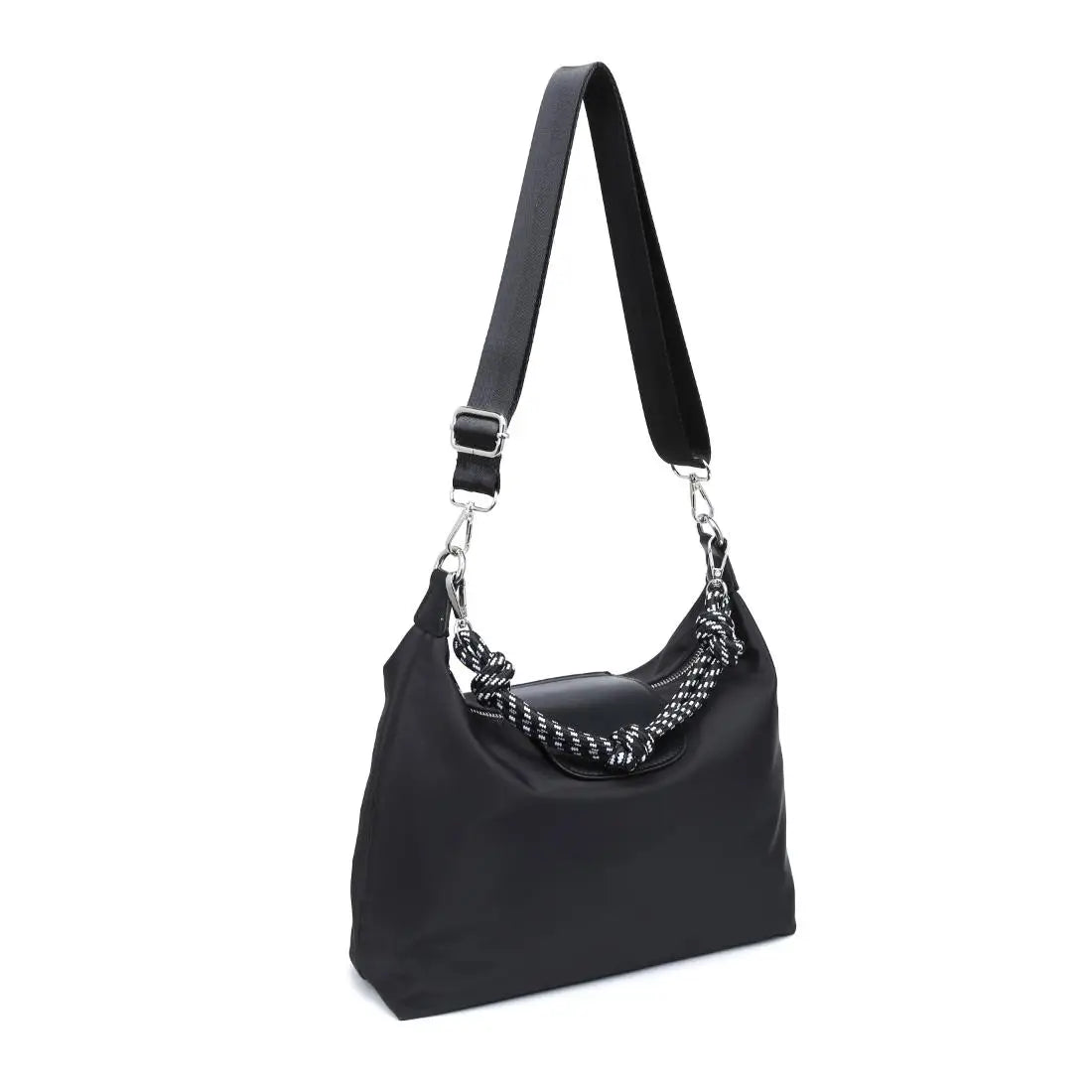 Knotted-rope Nova Hobo — sporty-chic versatility for everyday life. Roomy, lightweight silhouette with secure top zip, front snap flap pocket, and internal organization for wallet, keys, phone. Two carry options: adjustable wide strap for shoulder or crossbody, knotted rope handle for a hand-held statement. Durable shell, polished hardware, easy-care finish. Modern proportions that move from office to weekend, a smart, trend-forward choice for women who value function, thoughtful details, and clean, contemporary design. *Item Type: Hobo *Material: Nylon